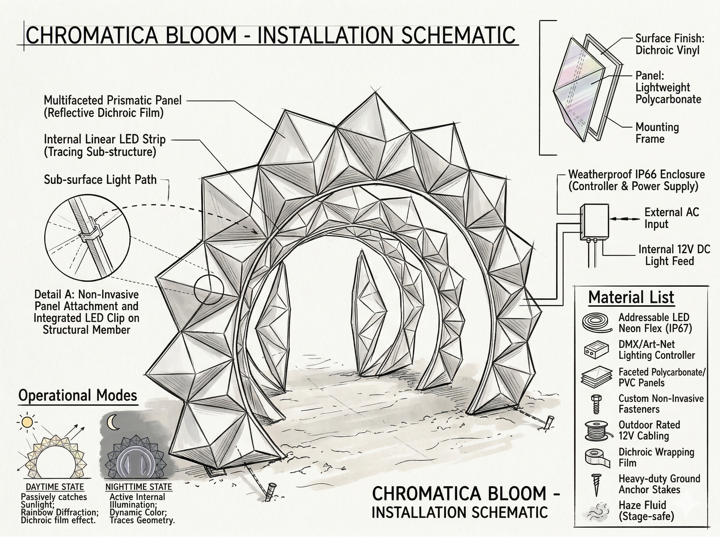 The installation Chromatica reimagines the portal as a kinetic experience. The faceted geometry is designed to mimic crystalline growth, with each panel acting as a complex reflector. The goal is to blend architectural form with reactive light, turning a physical arch into a vessel for temporal energy.